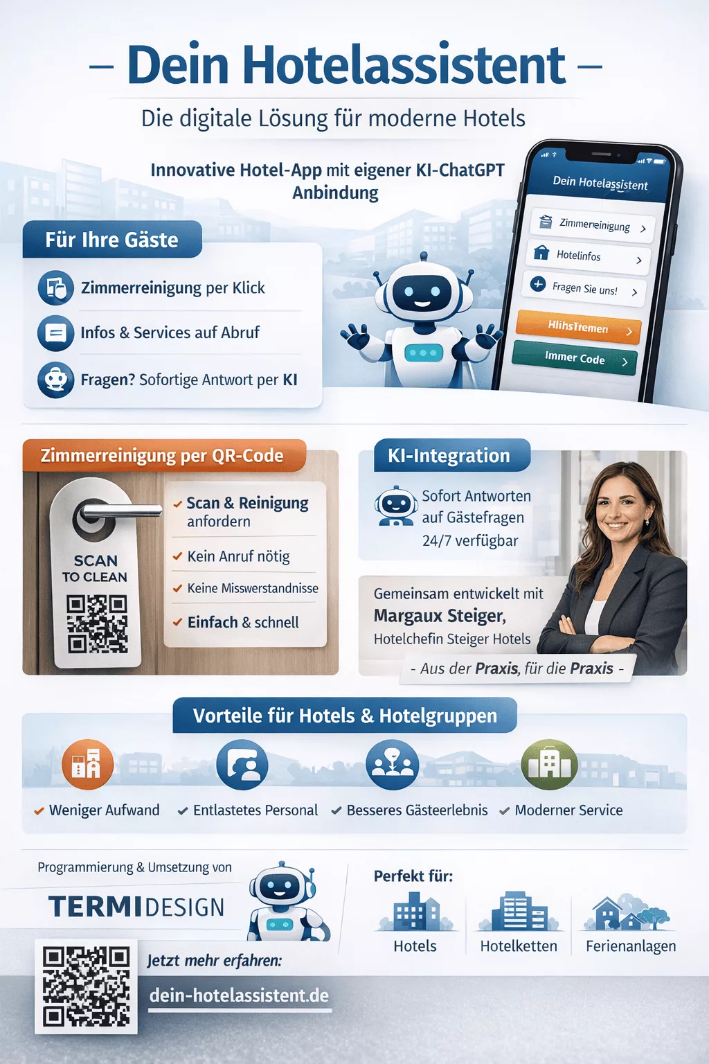 Mit dem digitalen Hotelassistenten entstand eine zentrale Plattform, die Zimmerservice, Hotelinformationen, QR-Code Prozesse und eine integrierte KI miteinander verbindet.
