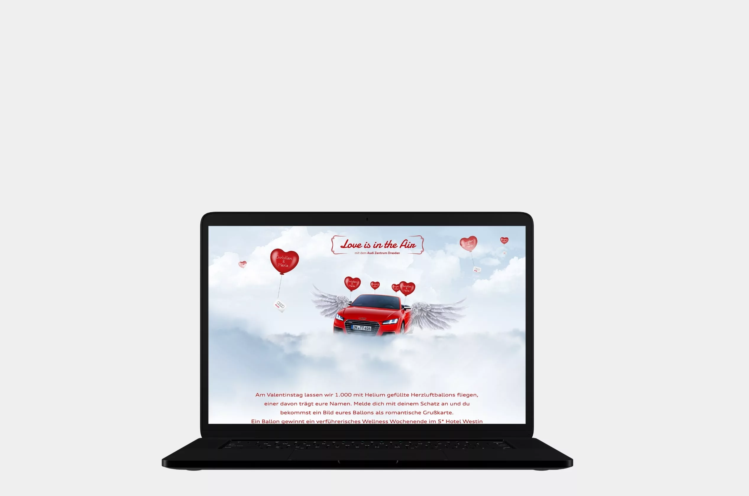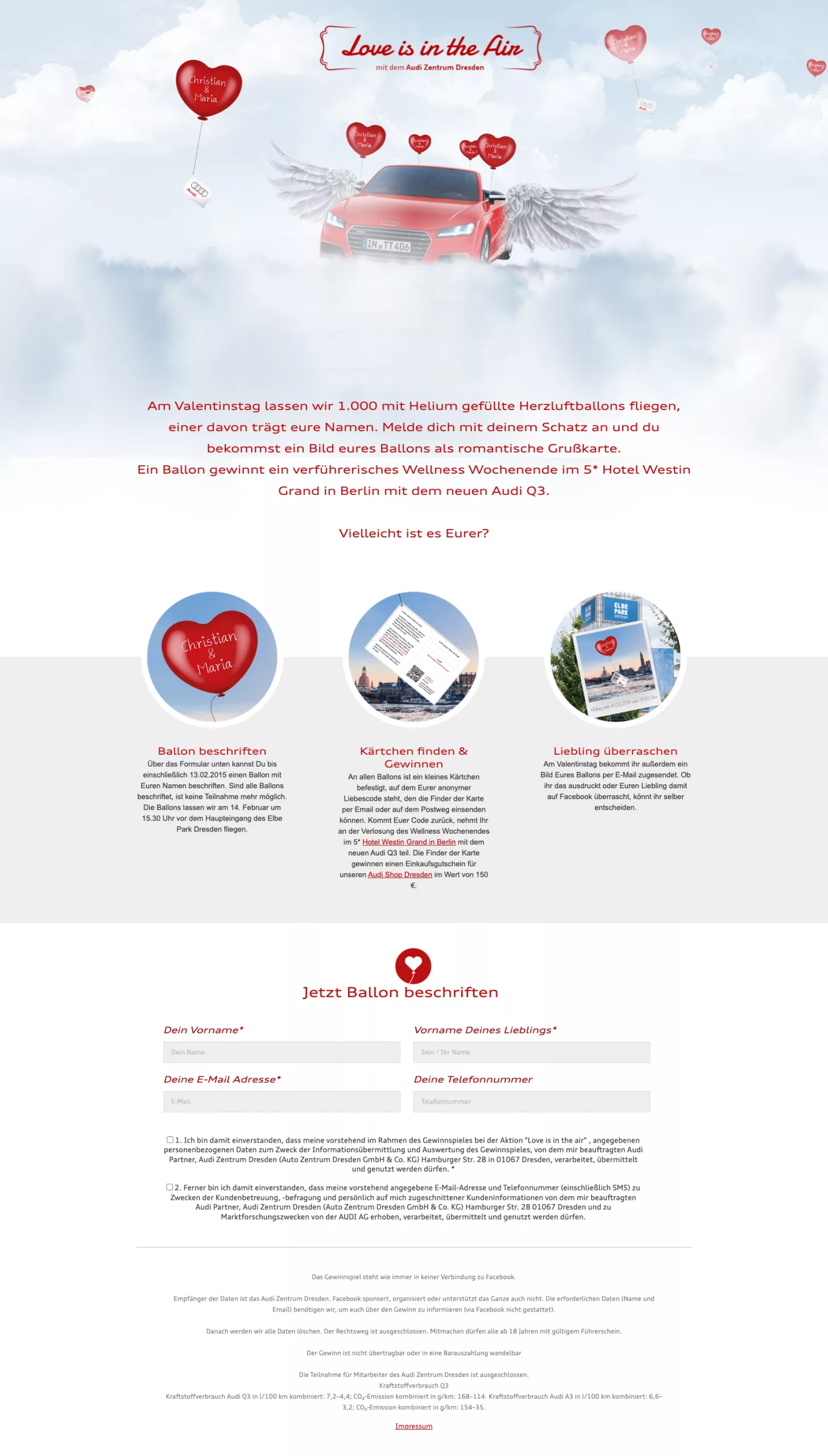 An jedem unserer Ballons ist ein kleines Kärtchen befestigt, auf dem Euer anonymisierter Liebescode steht. Wenn Ihr diesen Code findet, könnt Ihr ihn per Email oder auf dem Postweg an uns senden. Sobald Euer Code zurückkommt, nehmt Ihr automatisch an der Verlosung unseres exklusiven Wellness Wochenendes im luxuriösen 5-Sterne Hotel Westin Grand in Berlin teil. Und als ob das nicht genug wäre, gibt es noch einen weiteren Gewinn: die Finder der Karte erhalten einen Einkaufsgutschein im Wert von 150 € für unseren Audi Shop Dresden.