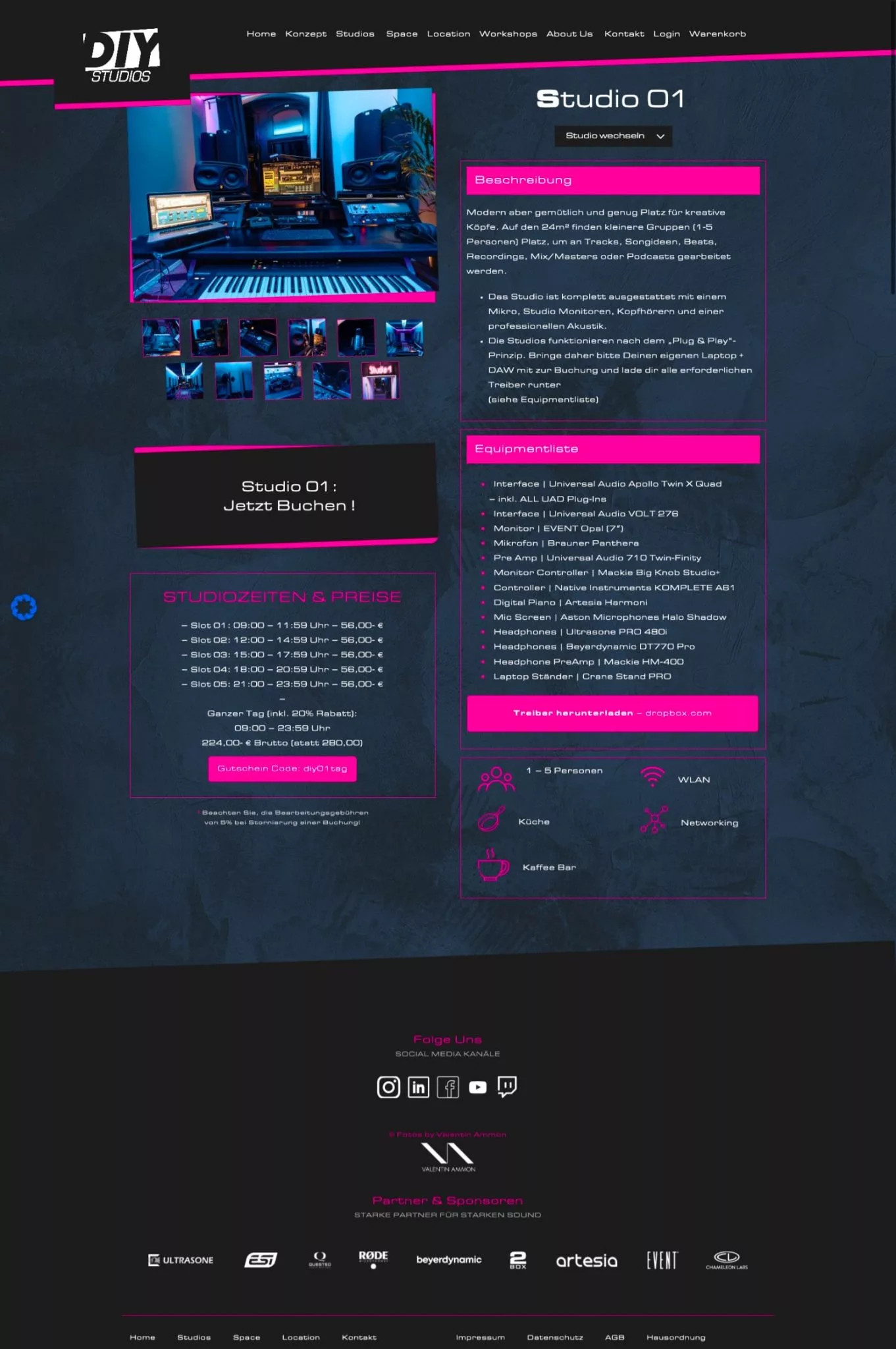 - Alle Studios können separat über einen Terminkalender gebucht werden, dieser Kalender zeigt Verfügbare Uhrzeiten und Preise direkt an.